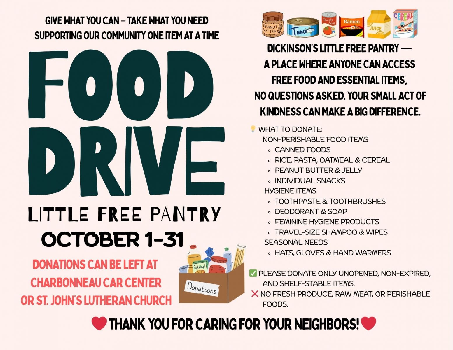 The October community development event is a Food Drive, click here to see the flyer for details.